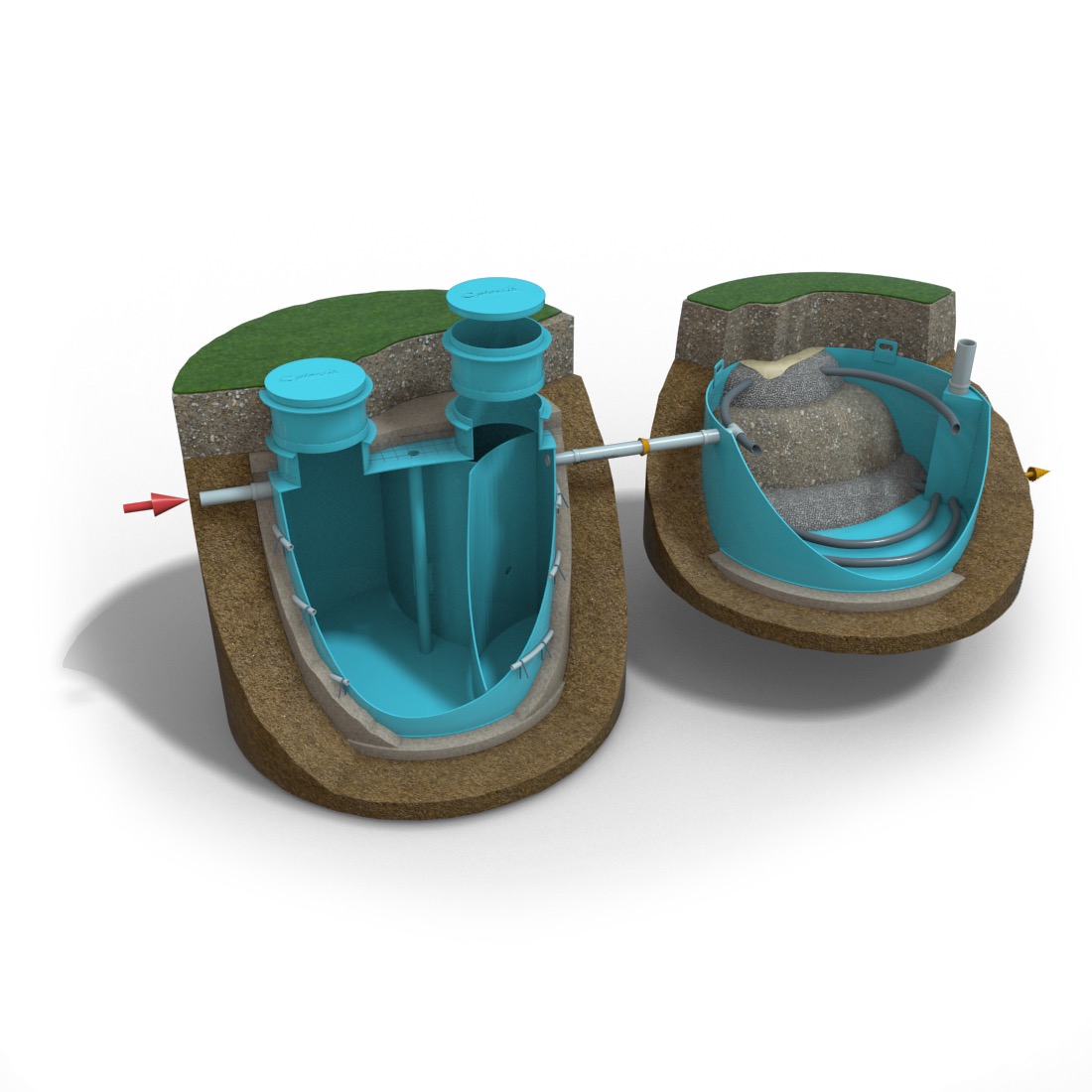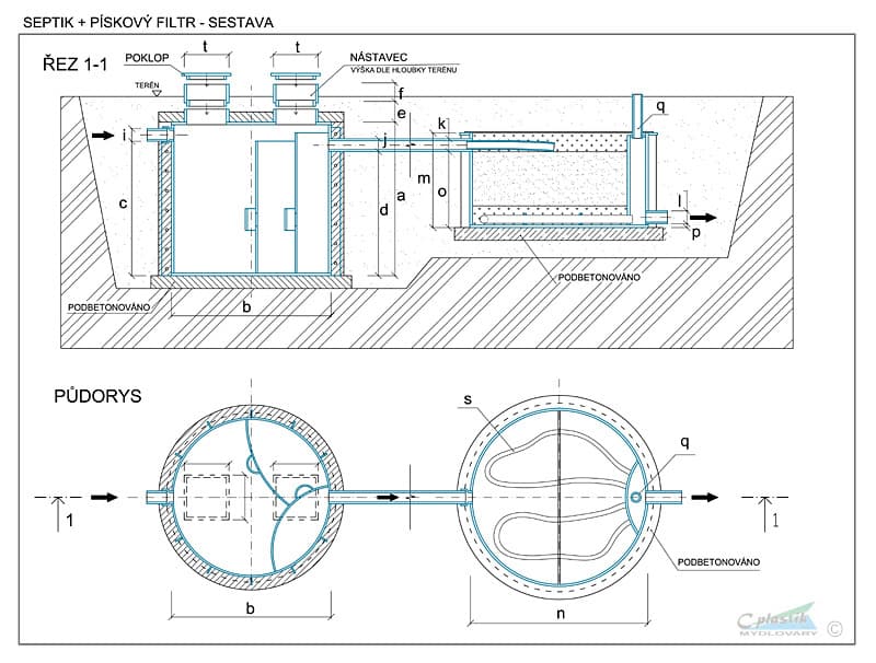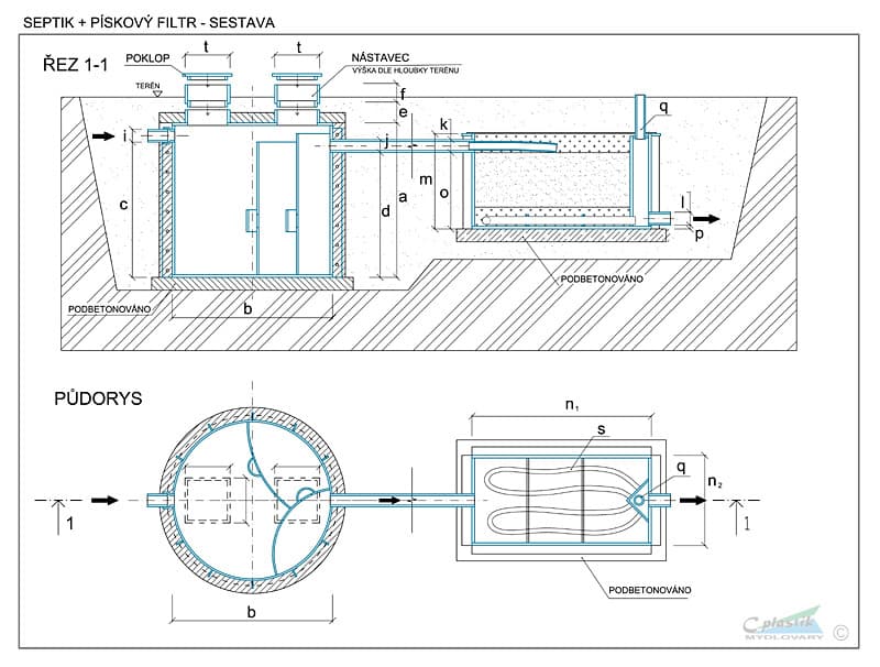 | Příslušenství kompletu: | 2x kontrolní revizní šachta septiku ⌀600 mm, výška 300 mm s možností nastavení výšky, kontrolní revizní šachta filtru, rozvodné a sběrné drenážní potrubí filtru, krycí geotextilie filtru, | |||||