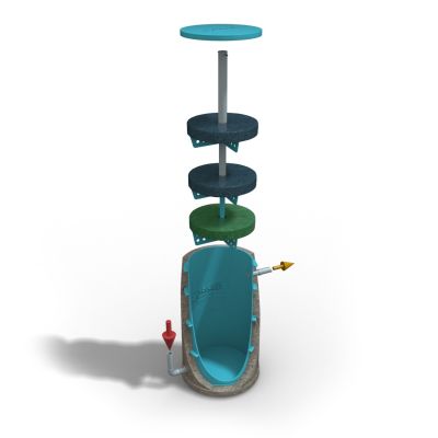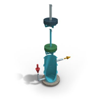 Předčištěná voda natéká do dolní části filtru potrubím a protéká vrstvami filtračních rohoží k odtokovému potrubí v horní části filtru.