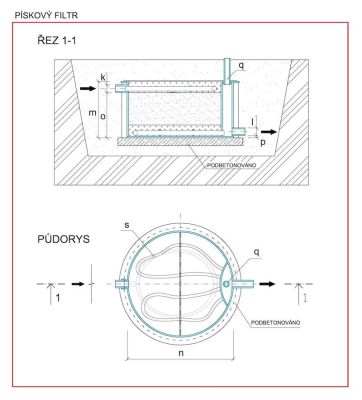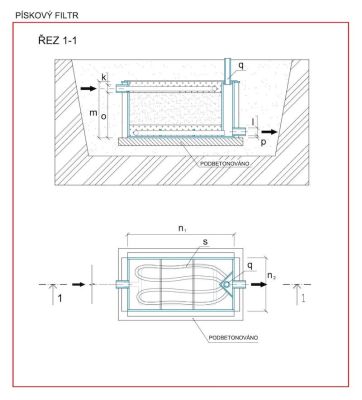 Předčištěná voda natéká v horní části rozvodným drenážním potrubím a gravitačně protéká vrstvou filtračního materiálu ke sběrnému potrubí na dně nádrže. Odtud odtéká přes kontrolní revizní šachtu do odtokového potrubí.